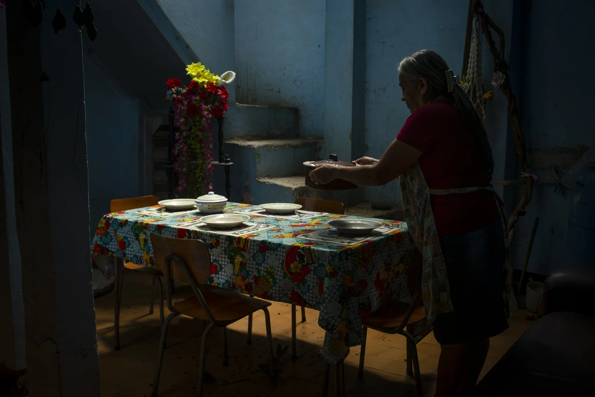 El foco está en la olla, de allí ese desenfoque en los otros platos, escalera y flores. La señora Dulce emerge desde la penumbra con el almuerzo para 4. Solo 4.